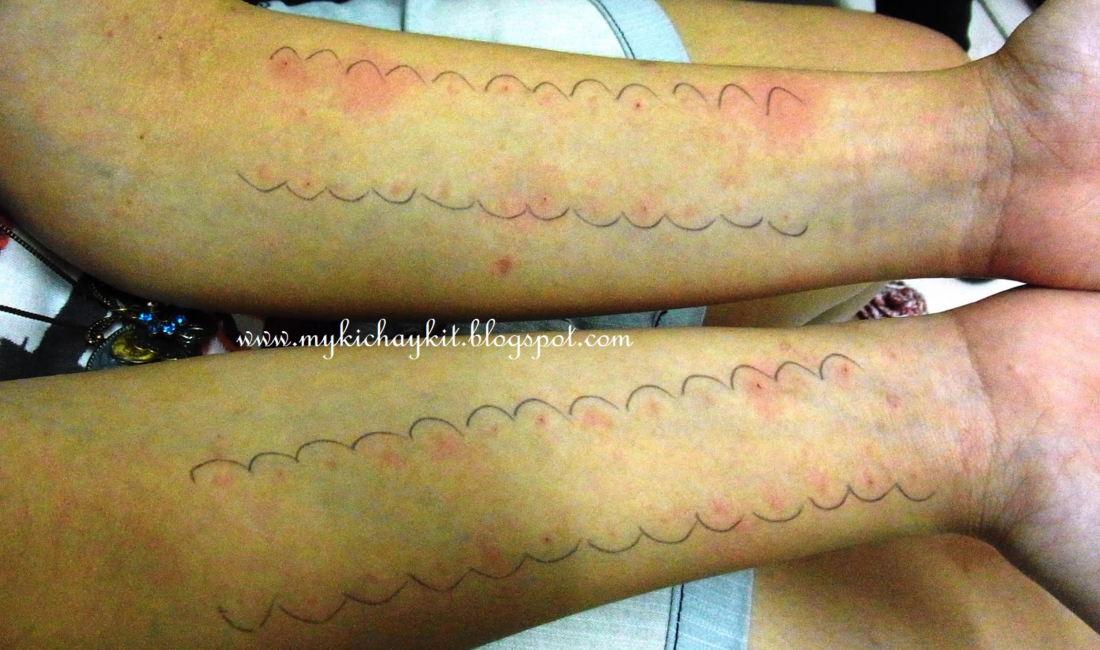 Moving on, the doc started drawing marks on my forearms. These are the areas where she will "gently" prick all those allergens on the surface of my skin.